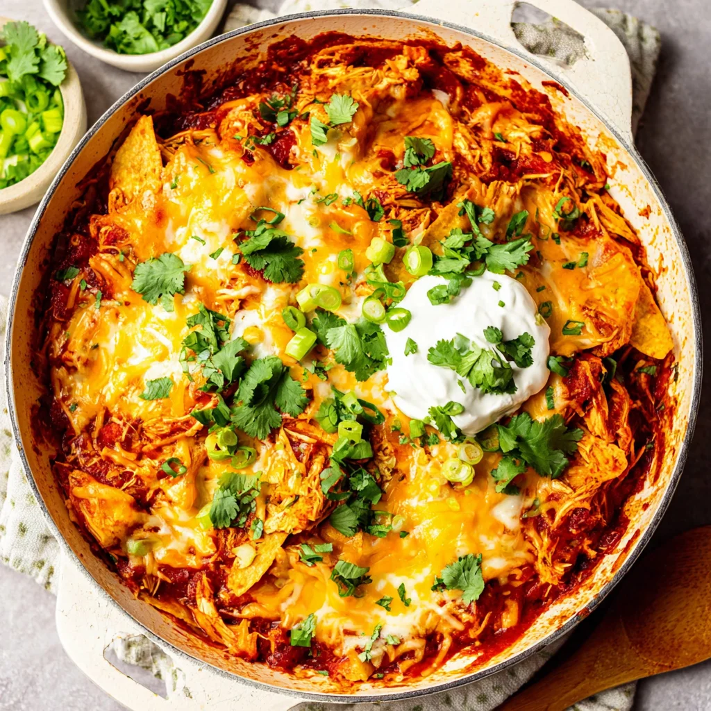 Sprinkle the shredded cheese evenly over the entire surface of your Chicken Enchilada Skillet. Cover with a lid or foil and let it rest off the heat for 2-3 minutes until the cheese melts completely. This final step creates that irresistible gooey top layer that makes every bite special. Garnish with fresh cilantro and sliced green onions for a pop of color and freshness.